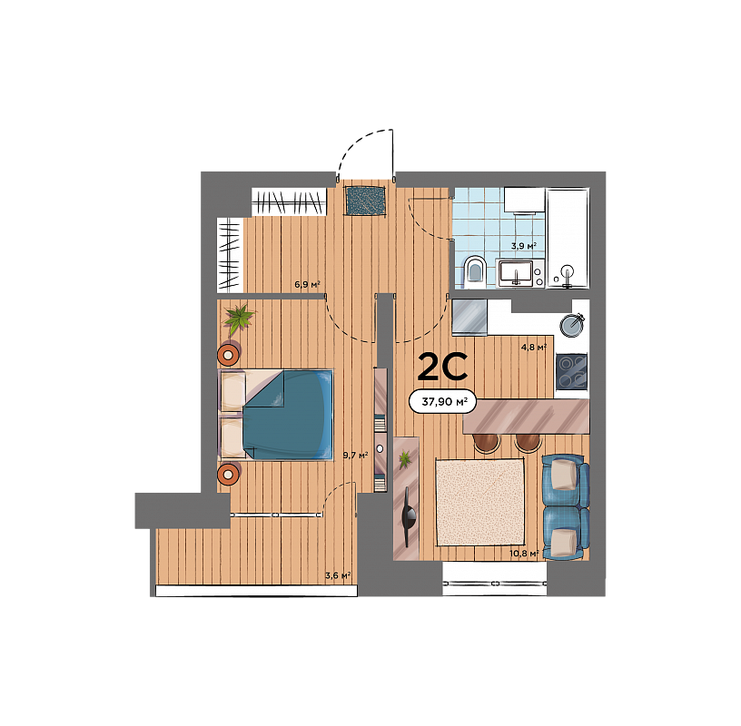 2К студия 37,9 м²