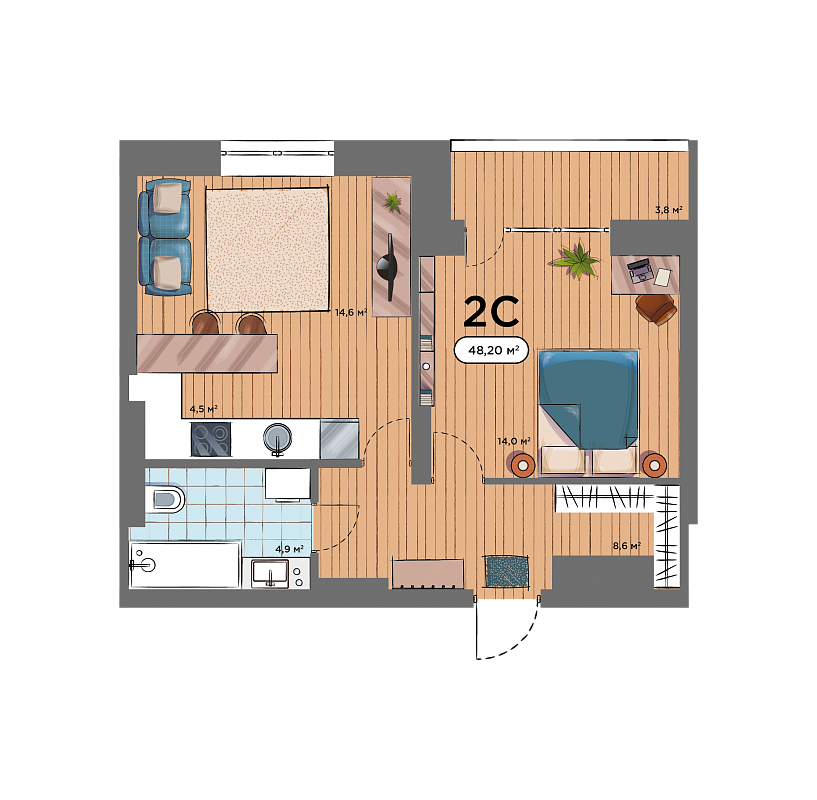 2К студия 48,2 м²
